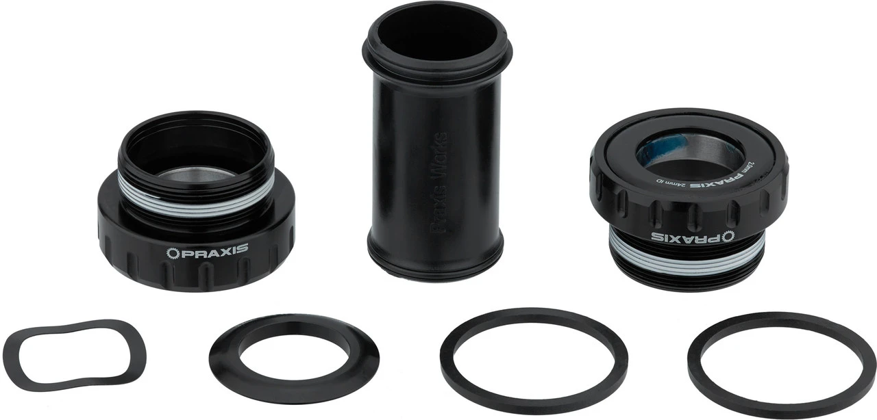 Mit dem Praxis Works M24 Innenlager kannst Du eine Praxis M24, Oval Concepts M24 oder SRAM GXP Kurbel mit Stahlachse in einen BSA 68/73 mm Road- oder MTB-Rahmen einbauen. Auf der Antriebsseite findet sich ein 24 mm Lager, auf der Nicht-Antriebsseite ein 22 mm Lager. Es handelt sich um Industrielager aus Stahl.