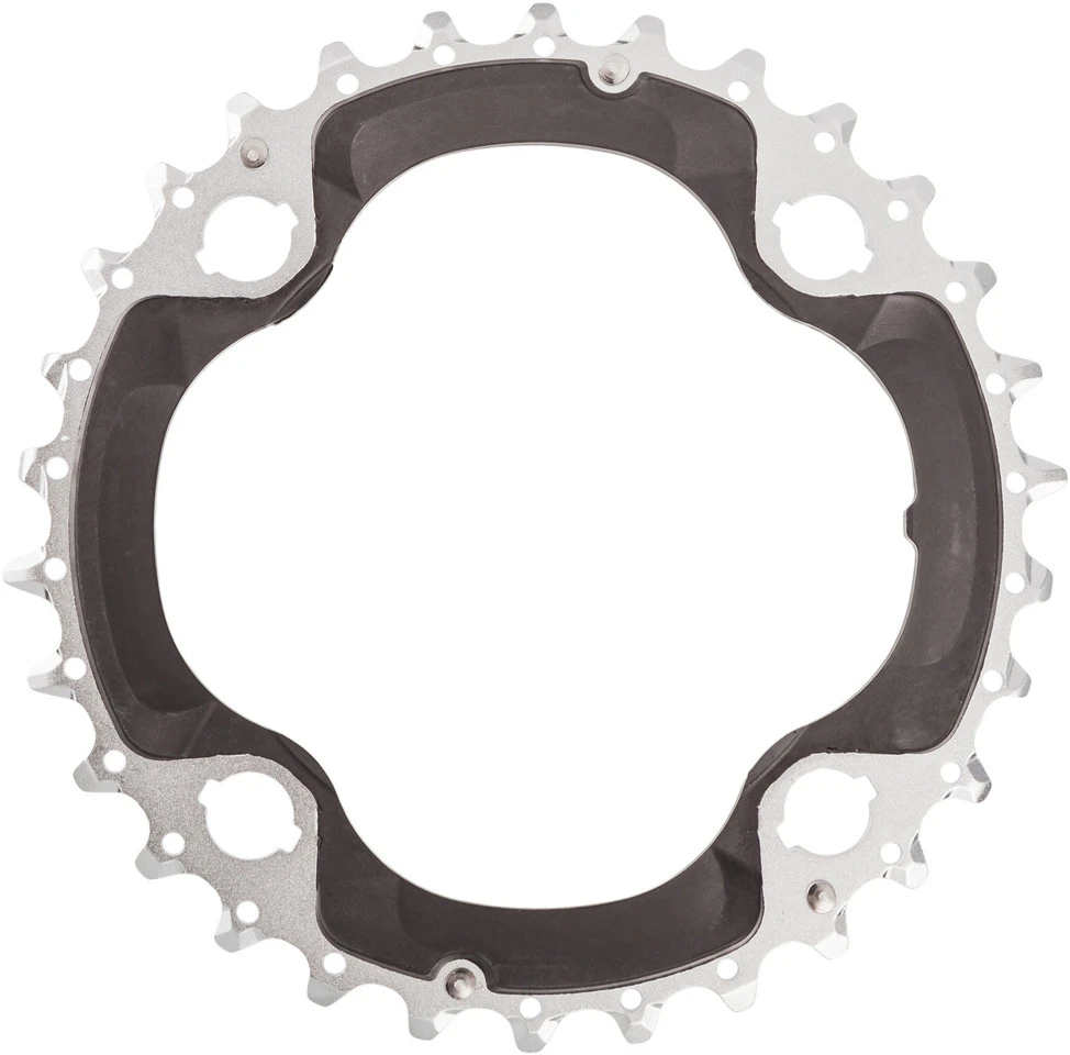 Dieses Shimano XT 10-fach Kettenblatt ist kompatibel mit der FC-M782 Kurbel und hat einen Lochkreis von 96 bzw. 64 mm (symmetrische 4-Arm Konstruktion). Es lässt sich damit die Kombination 22-30-40 Zähne bilden. Das mittlere Kettenblatt besteht aus einem Stahl-Carbon-Verbund, die beiden anderen sind aus Aluminium gefertigt.